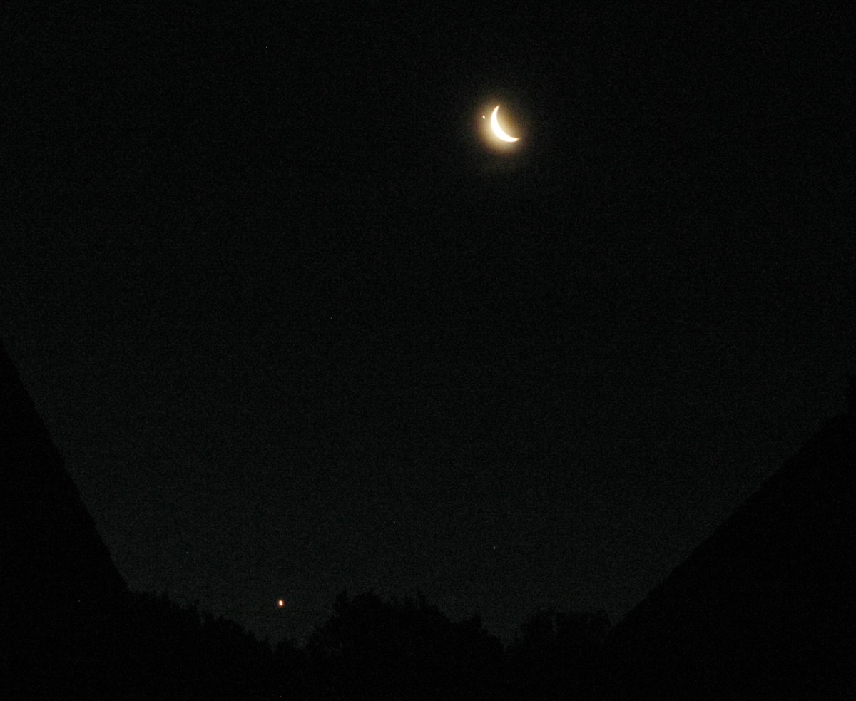 Der erste Schnappschuß von der nahen Begegnung Mond/Jupiter. Leider ohne Stativ