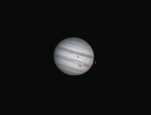 Jupiter mit dem Mond Io, der seinen Schatten auf Jupiter wirft und dazu der GRF. Aufnahme