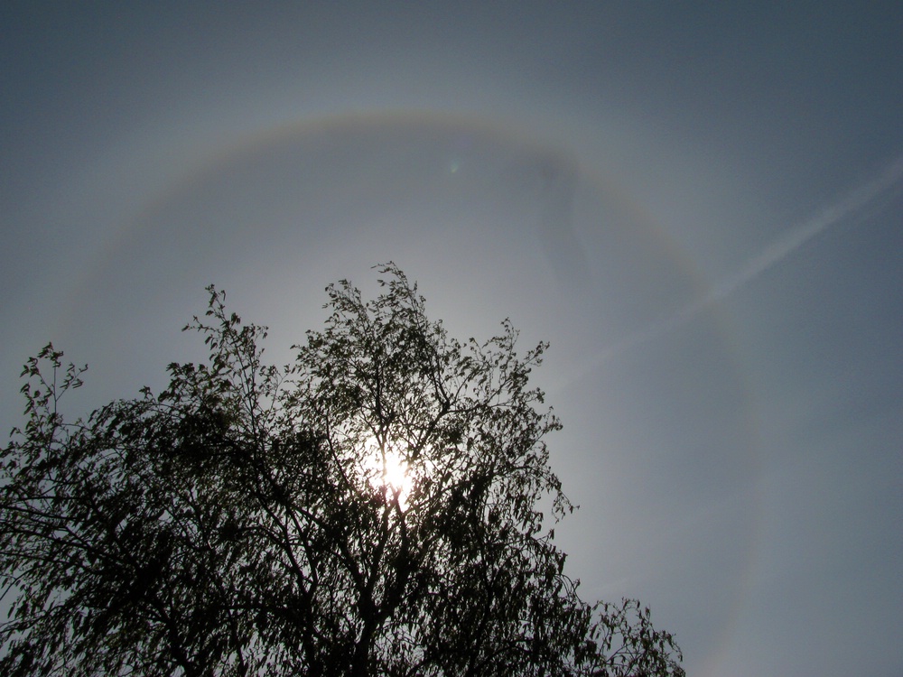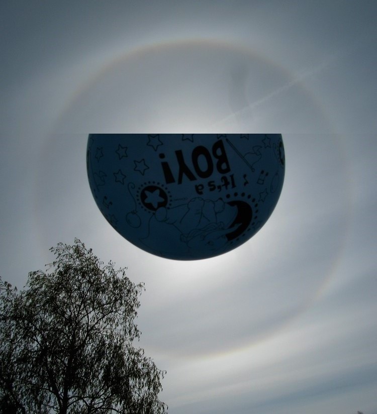 Sehr kräftiger Sonnenhalo am 29.04.2015. Das obere Bild ist ein (schlechtes) Mosaik aus zwei Teilen, ein Luftballon diente als Blendschutz.