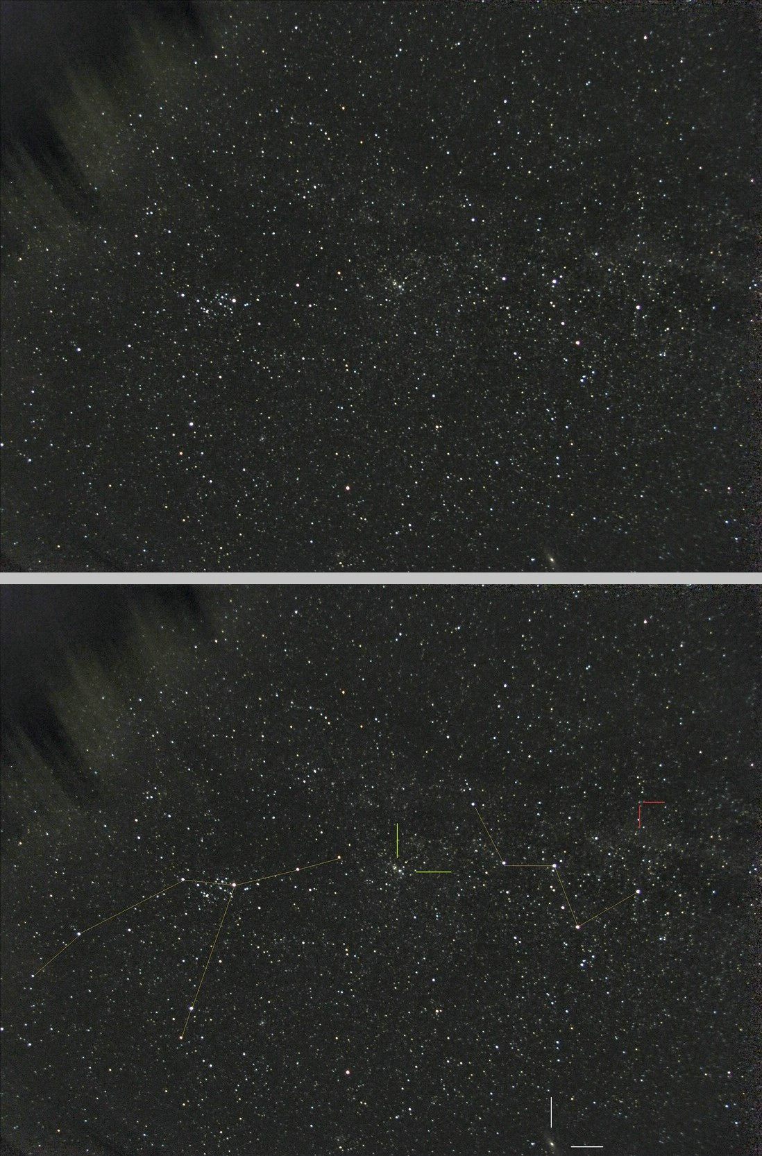 Sternbilder Perseus und Kassiopeia. Im unteren Bild dazu Hilfslinien zum Erkennen der Sternbilder.
