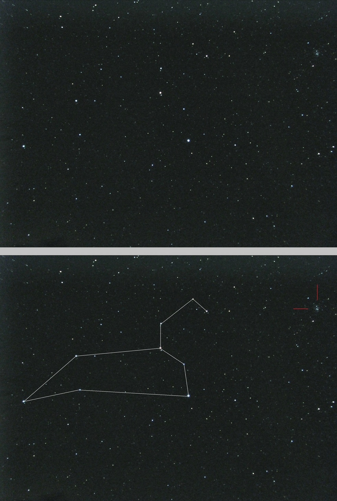 Sternbild Löwe. Im unteren Bild ist dazu M44 im Krebs markiert